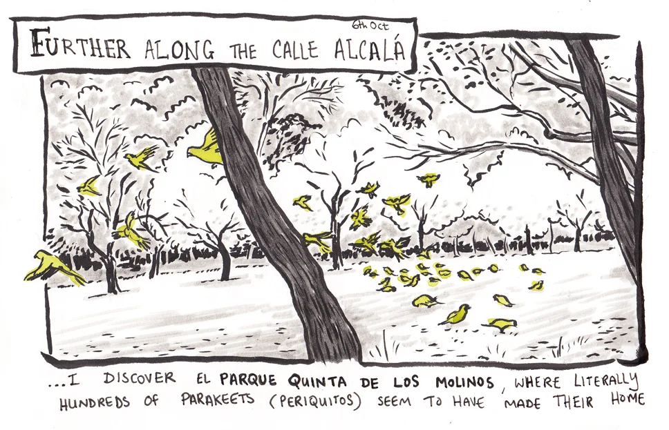 Just last week, I was marvelling at the fields covered in bright green parakeets in Quinta de los Molinos, which is a beautiful park in the north-east of Madrid, on the way to Barajas airport. There were multiple groups of 40 or so, contentedly feeding on the rough grass, all around the park. I've become used to seeing them in London parks over the last few years, but never in such quantities. Then today, I came across numerous news articles such as this, published in the last few days, about how this species of bird is "invading" Madrid and threatening the ecosystem. After seeing so many of them all in one place, I don't doubt it. But still, you can't deny they're more beautiful to look at than your average pigeon.
